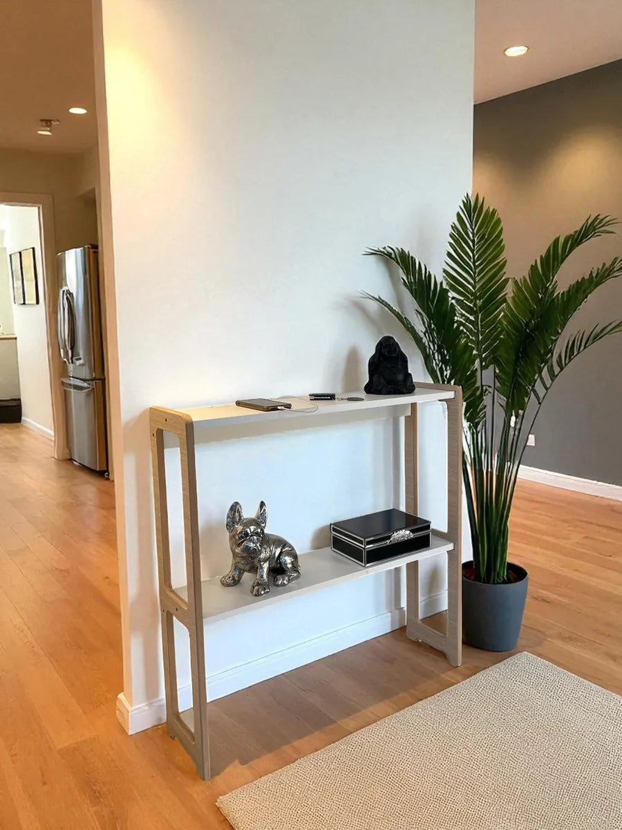 Esta mesa recibidora funciona como un mueble práctico para colocar llaves, decoración, libros, lámparas o elementos decorativos al entrar a casa. También sirve como soporte auxiliar en living o comedor, ideal para ambientes con espacio limitado o para quienes buscan un mueble funcional con diseño moderno.
