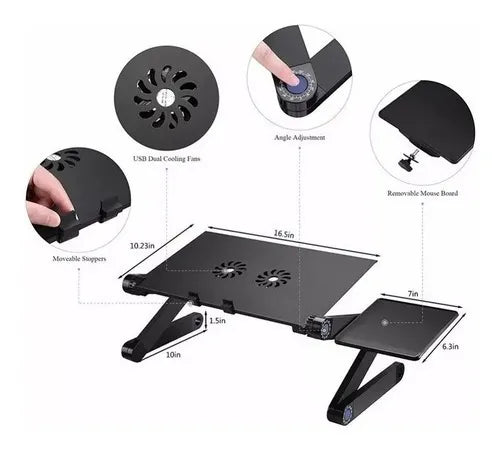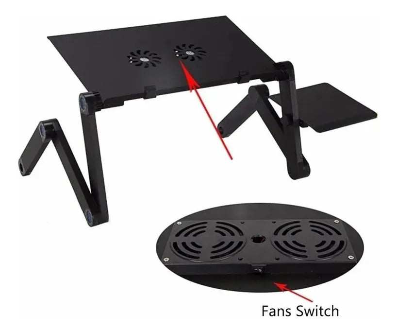 Optimizá tu espacio de trabajo o estudio con esta mesa soporte versátil y ergonómica. Diseñada para usar con laptops, iPads y portátiles, permite ajustar la altura según tus necesidades, incluye ventiladores para mantener tu dispositivo fresco y una superficie de mousepad para mayor confort. Ideal para casa, oficina o estudio.