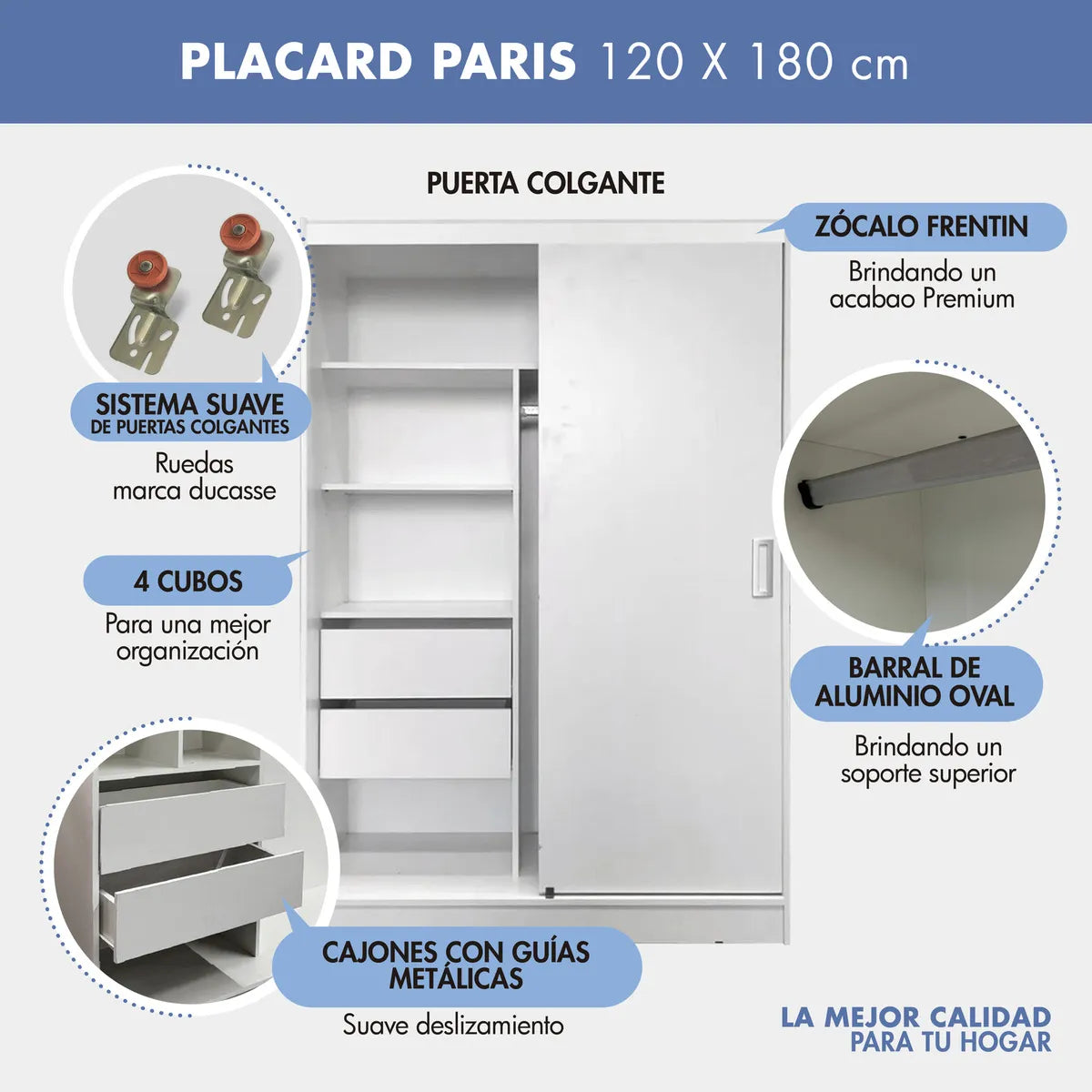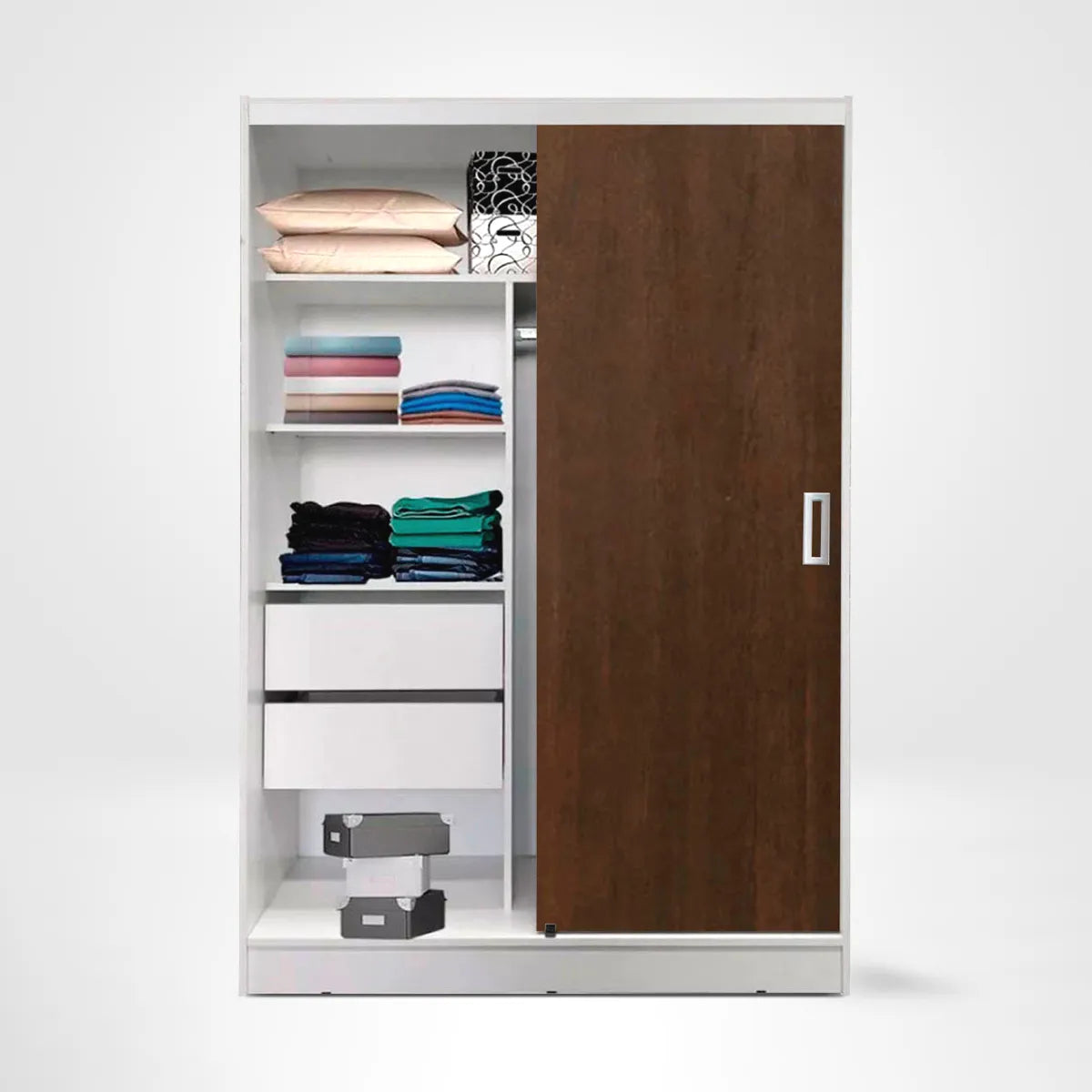 Este placard con puertas corredizas es una solución versátil para dormitorios o espacios con poca profundidad. Gracias a sus medidas (120 cm de ancho por 180 cm de alto), ocupa menos espacio que un ropero tradicional, pero ofrece un excelente almacenamiento interno: tiene estantes, cajones y barra para colgar.