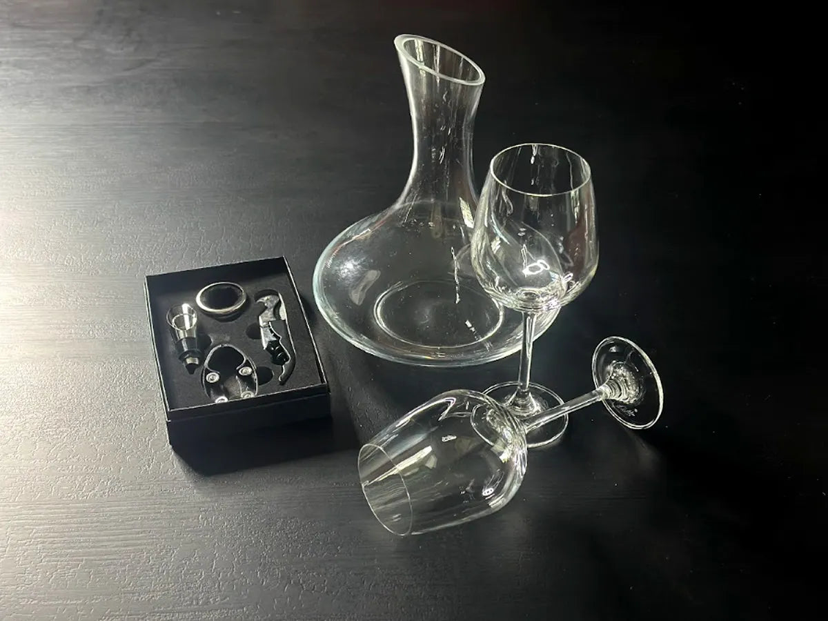Depende de la versión, pero típicamente incluye decantador, copas, vasos y herramientas para servir y conservar.