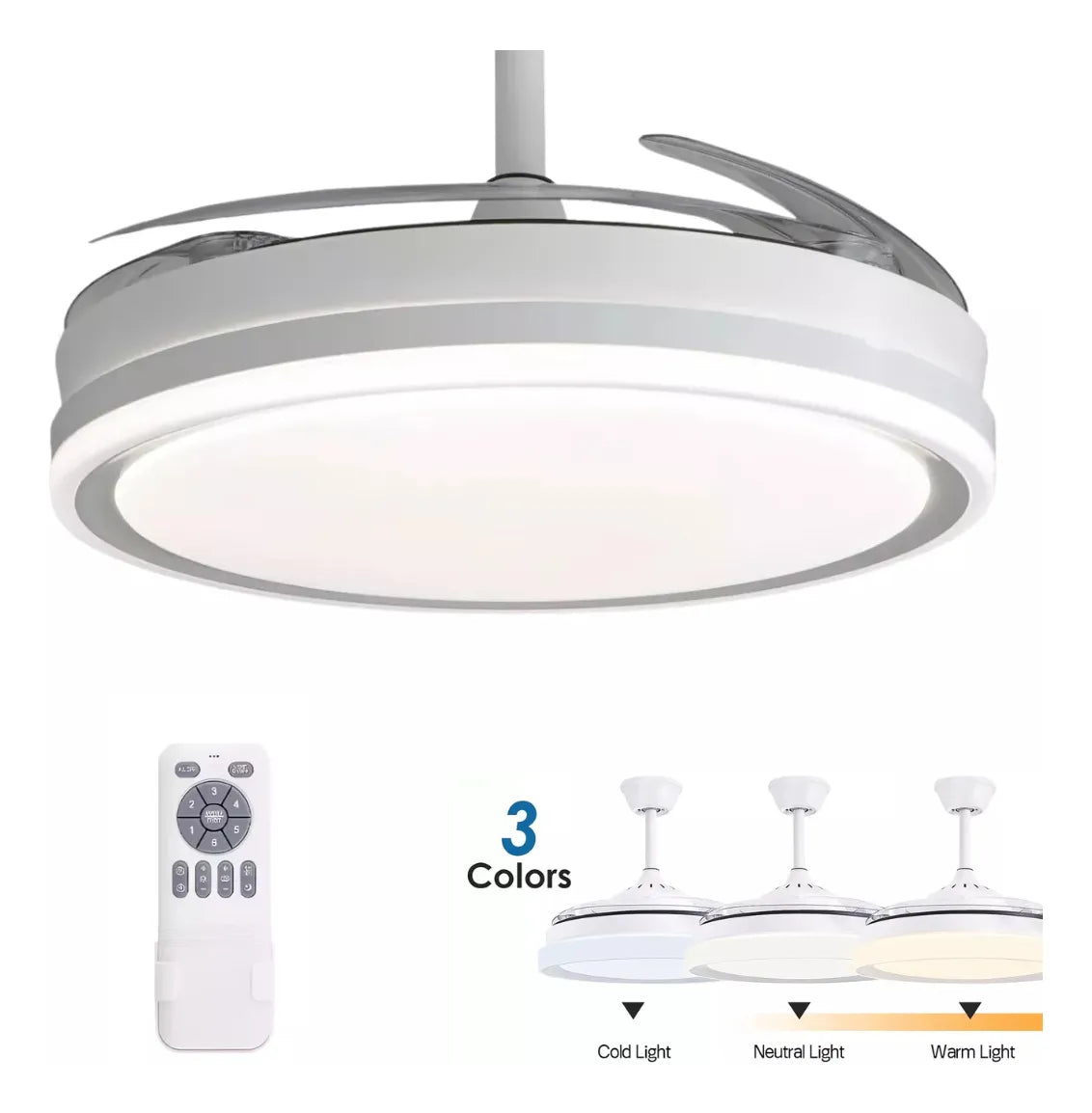 Es un ventilador de techo con aspas retráctiles y luz LED, diseñado para brindar aire fresco y luz a la vez, con un estilo moderno y funcional. Ideal para espacios interiores donde querés regulador de aire y luz sin ocupar superficie útil.