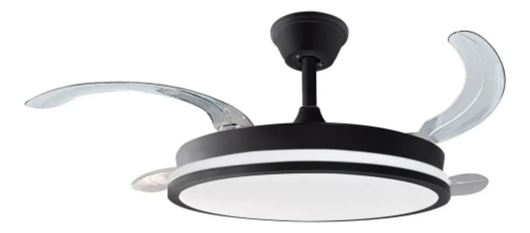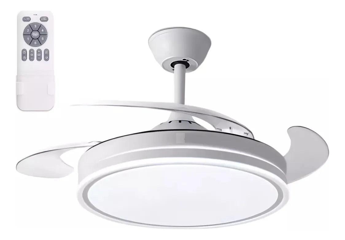 Este ventilador de techo combina diseño moderno con funcionalidad, ideal para mantener tus espacios frescos y bien iluminados. Sus aspas retráctiles se pliegan cuando está apagado para un perfil más discreto y se despliegan al encenderlo para una ventilación eficiente.